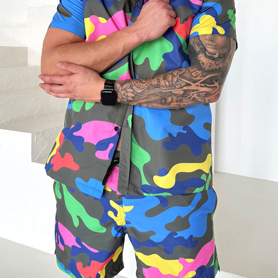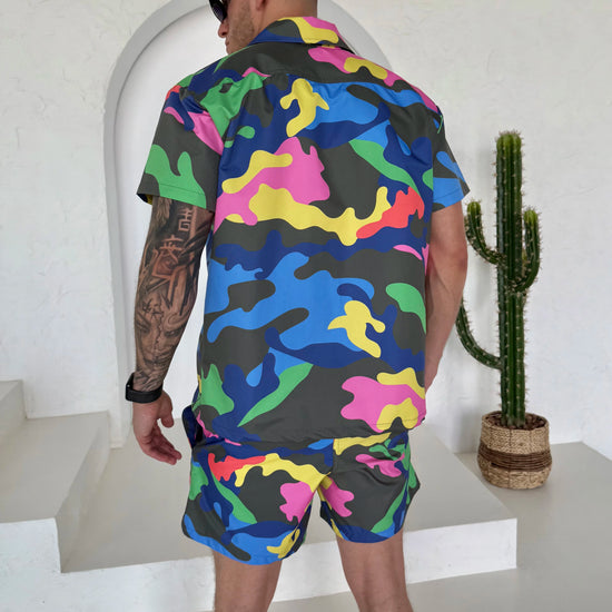 Men’s Beach Set Camo Bright – Multicolor is a high-impact summer outfit designed for men who love standout beachwear and bold vacation looks. Made from 100% quick-dry polyester, this set dries fast, keeps you cool and comfortable, and holds its shape through beach days, swimming, travel and active movement.