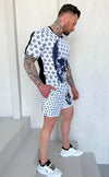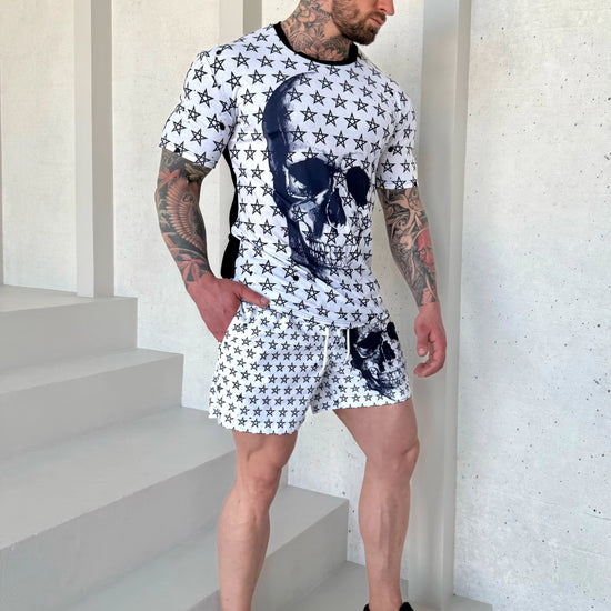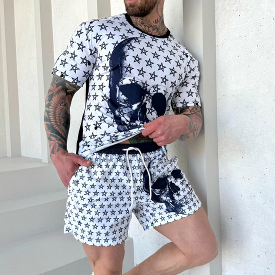 A bold, summer-ready two-piece outfit designed for beach days, vacations, pool clubs and travel. The Skull Stars print in white and navy mixes urban street style with tropical resort aesthetics, making this set one of the most eye-catching pieces of the season.