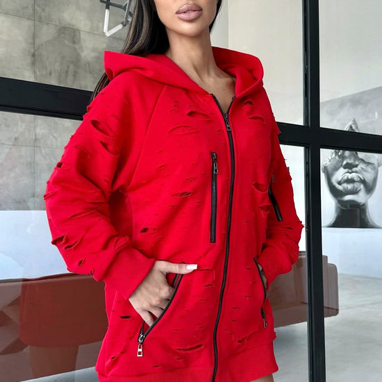 Women’s Designer Distressed Hoodie Destra Zipper — Red