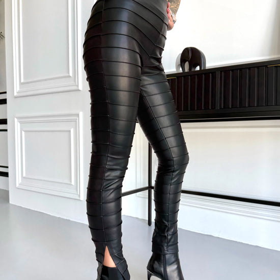 The signature element of this model is the ribbed faux leather paneling that runs across the legs in clean horizontal sections. These panels create a striking architectural effect, visually elongating the legs and giving the leggings a unique textural depth. The carefully constructed lines mimic a sculpted, moto-inspired aesthetic, offering a powerful and contemporary fashion appearance. At the bottom, a refined front slit adds movement, elegance, and a flattering break around the ankle — ideal for showcasing heels or sleek boots.