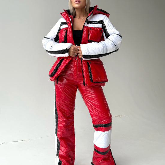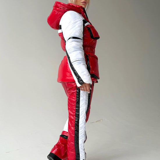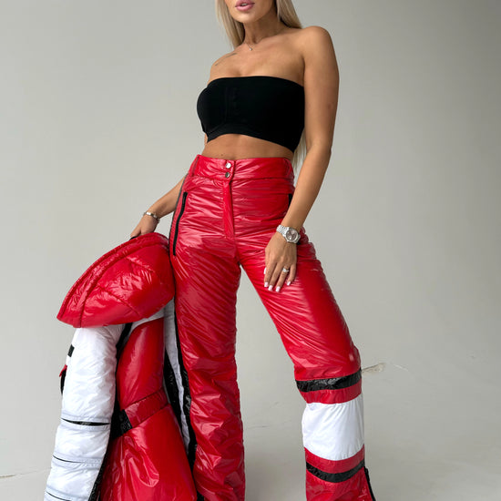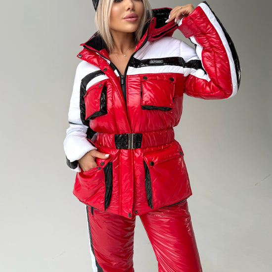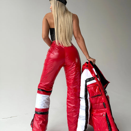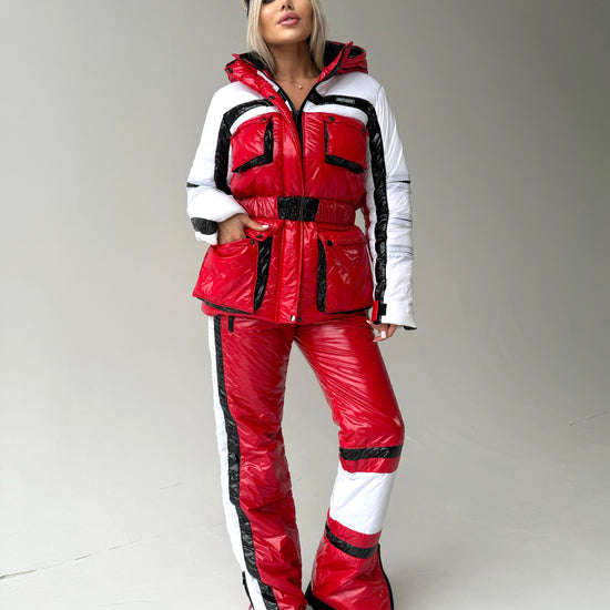 Red Glossy Two-Piece Ski Suit FREYA (Women) — designer snowsuit set by KRUTYAKOV