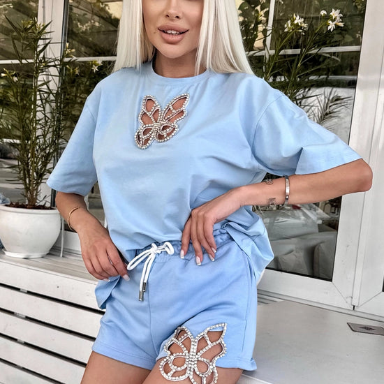 This light blue two-piece shorts set is a perfect buy when you want an easy summer outfit that still looks designer. Crystal butterfly cut-outs on the T-shirt and shorts shimmer in the sun and make every photo stand out.