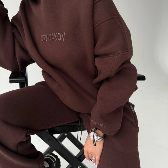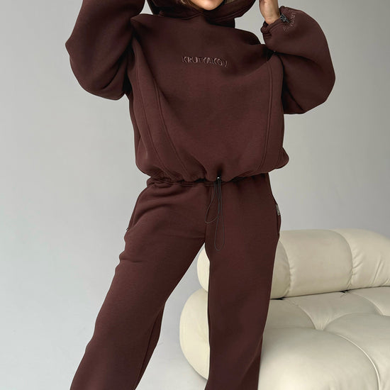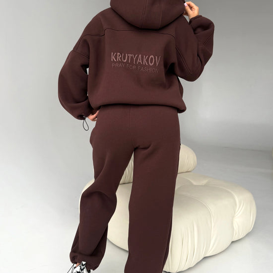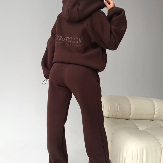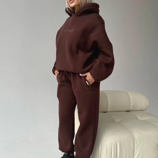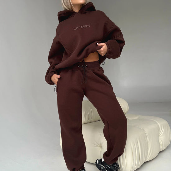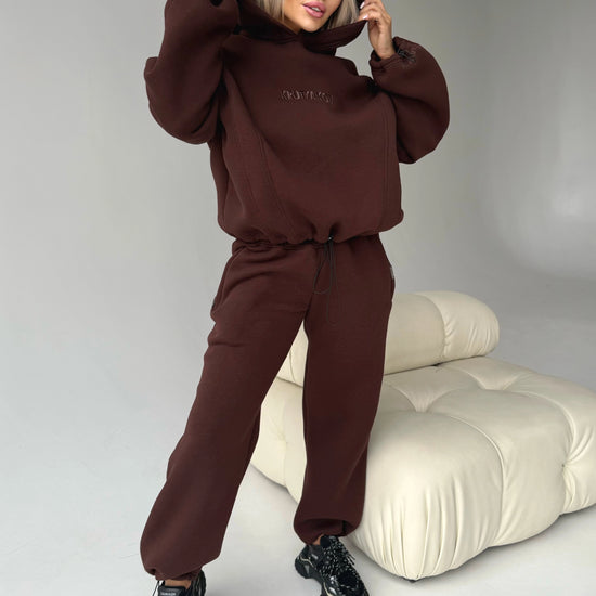 Meet one of our coziest designer sets created for cold-season comfort and a premium sporty-chic look. The Erika Brown tracksuit is crafted from high-quality fleece-lined fabric that is warm, dense, soft inside and durable for everyday wear. The deep chocolate-brown color gives the set an elegant and elevated appearance.