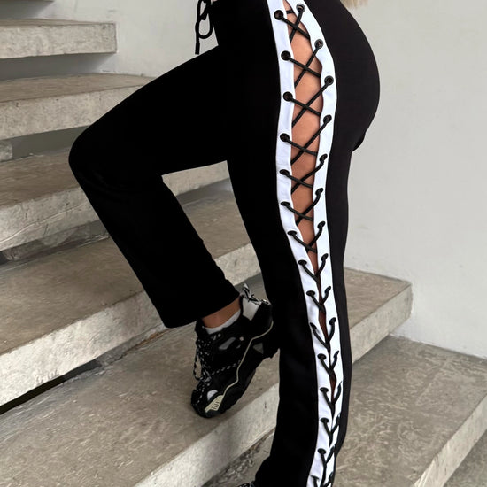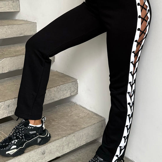 These sporty knit joggers mix classic black-and-white with bold side lacing. White side panels with eyelets and a black cord create a statement detail, while the straight leg fit keeps them comfy and easy to style with any sneakers or chunky boots.