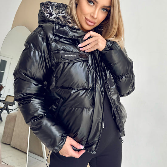 This women’s winter puffer jacket is designed to work effortlessly with leggings, jeans, joggers, and chunky boots, creating a contemporary streetwear look with a feminine edge. The glossy black finish and leopard hood lining make the Alpha jacket stand out while still being easy to style with your existing wardrobe.