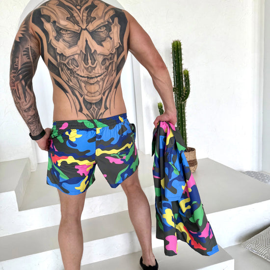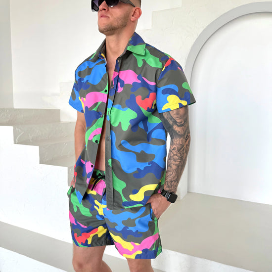 Men’s Beach Set Camo Bright – Multicolor is a high-impact summer outfit designed for men who love standout beachwear and bold vacation looks. Made from 100% quick-dry polyester, this set dries fast, keeps you cool and comfortable, and holds its shape through beach days, swimming, travel and active movement.