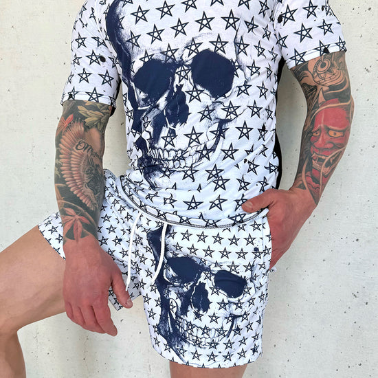 A bold, summer-ready two-piece outfit designed for beach days, vacations, pool clubs and travel. The Skull Stars print in white and navy mixes urban street style with tropical resort aesthetics, making this set one of the most eye-catching pieces of the season.