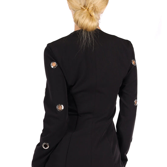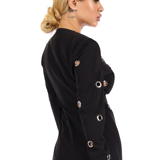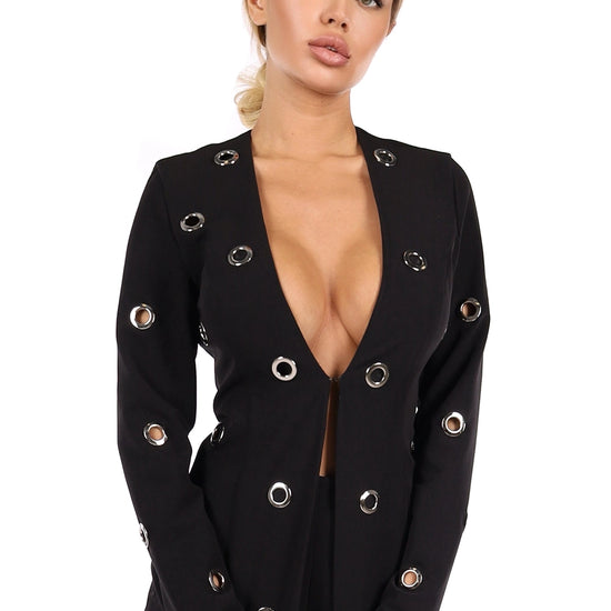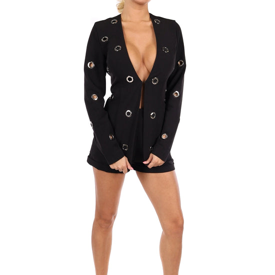 The star of the design is the large metal rings placed along the front, sleeves and shorts. These eye-catching silver-tone eyelets instantly elevate the suit, turning a classic black co-ord into a designer piece with a strong personality. Wear it with nothing underneath for a red-carpet, party or club look, or style it with a lace bralette, bodysuit or simple top for dinners, events or fashion shoots.