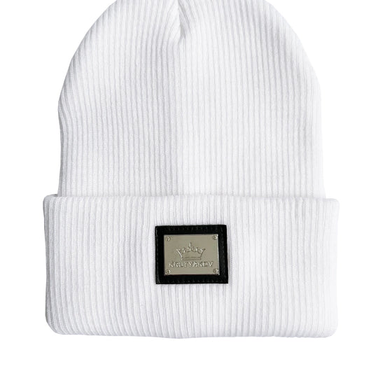 Women’s Beanie Hat Metal Logo – White