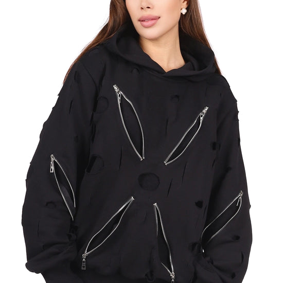 This black zip hoodie features statement metal chains, a sleek silhouette, and a premium cotton-blend texture for unmatched comfort and edge.