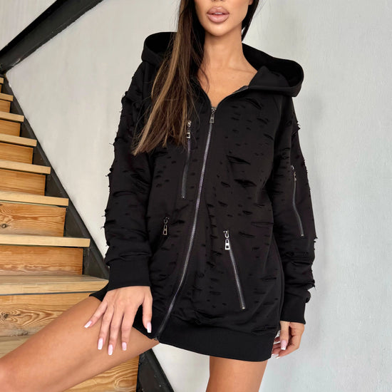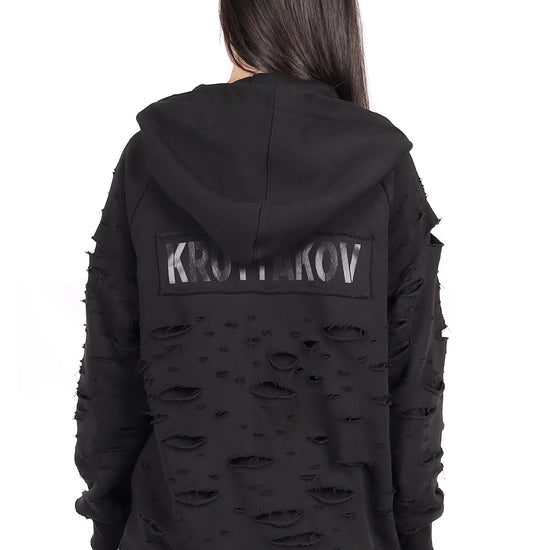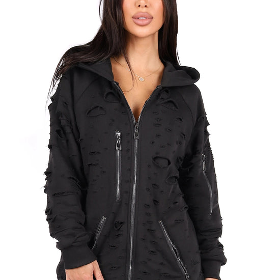 Women’s Designer Distressed Hoodie Destra Zipper — Black