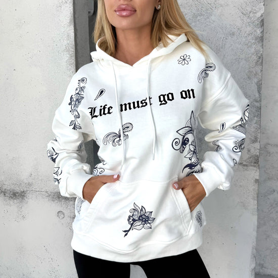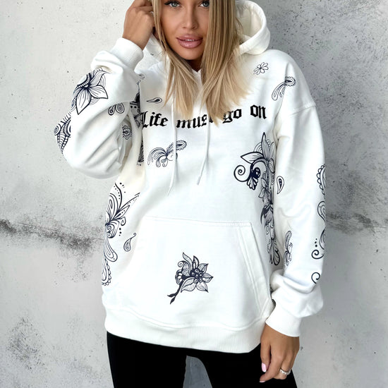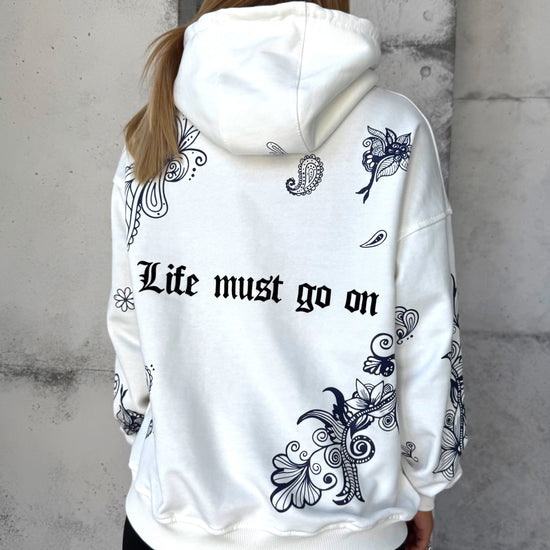 The warm, creamy milk-white shade gives the hoodie a fresh and elevated look — softer and richer than a standard cold white. It pairs effortlessly with jeans, leggings, neutral joggers, cargo pants or monochrome sporty outfits. The signature LMGO print (“Life Must Go On”) and artistic graphic elements on the sleeves and back add depth and personality, transforming the hoodie into a true statement item in your wardrobe.