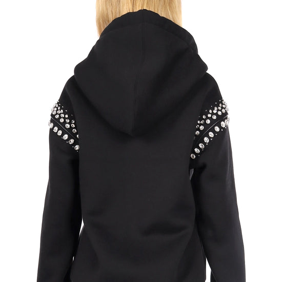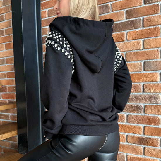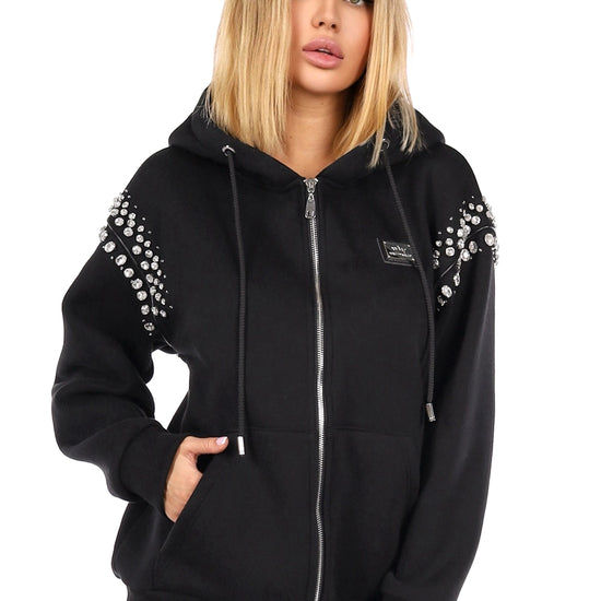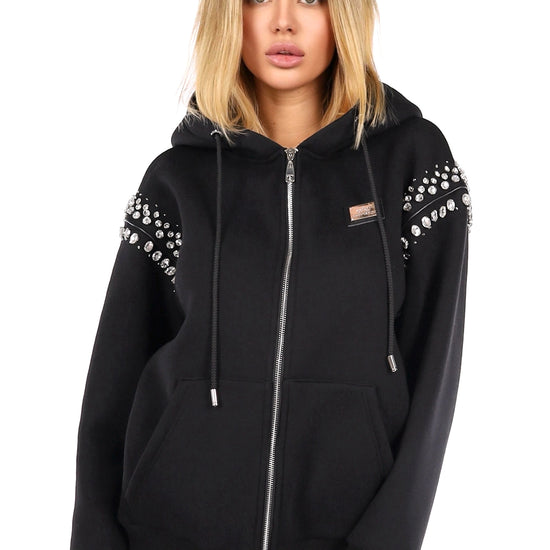 The hoodie features a full-length zipper, comfortable hood, kangaroo pocket, and a slightly relaxed silhouette that flatters all body types. The deep black shade, combined with the shimmering crystal detailing, makes this hoodie stand out both during the day and at night.