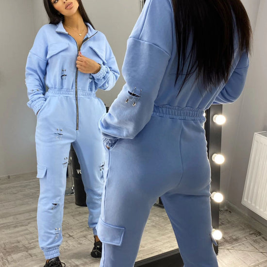The silhouette is fitted but not tight, with a front zipper that lets you play with the neckline – from casual daytime to sexy evening. The main accent is the cut-out details held by metal pins on the sleeves and legs. They create a “ripped but controlled” look that instantly stands out in photos and real life, while still keeping the jumpsuit wearable and practical.