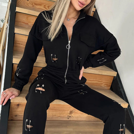 The silhouette is fitted but comfortable, with a front zipper that lets you adjust the neckline from casual daytime to party-ready deep V. The main accent is the cut-out details fixed with metal pins on the sleeves and legs. They create a controlled “ripped” effect that instantly stands out in photos and real life, while the base remains practical and wearable.