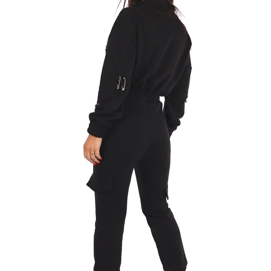 Style it with sneakers and a crossbody bag for a daytime street look, or with heels and a clutch for an evening outfit. If you want to buy a black jumpsuit for women that looks designer and different from typical basics, the Pins model is exactly that.