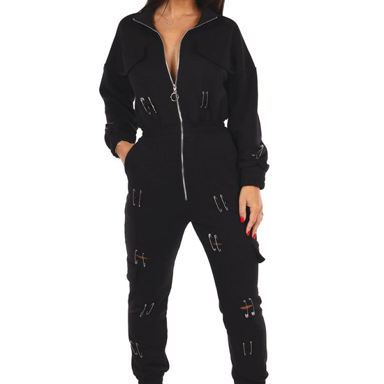 Looking for where to buy a stylish black cut-out jumpsuit for women with metal pin details? Choose the Pins jumpsuit by KRUTYAKOV – a bold, comfortable one-piece with free shipping that will make every outing feel special.