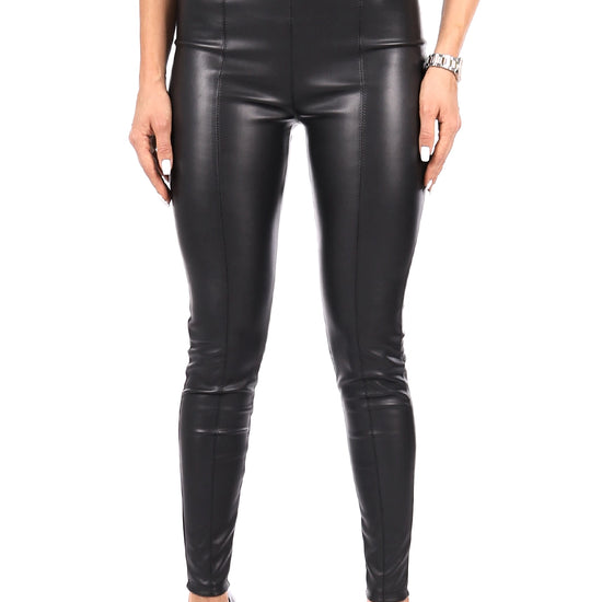 The high-waist construction gives reliable support and ensures a secure fit throughout movement. The dense but flexible faux leather fabric provides structure while maintaining comfort, allowing the leggings to move seamlessly with the body. The polished black finish adds depth and sophistication, pairing effortlessly with a wide range of wardrobe pieces: oversized sweaters, bodysuits, cropped jackets, tailored blazers, and evening tops.