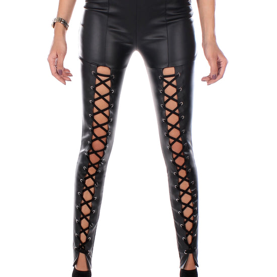 WOMEN’S LACE-UP PANEL FAUX LEATHER LEGGINGS LACING — BLACK