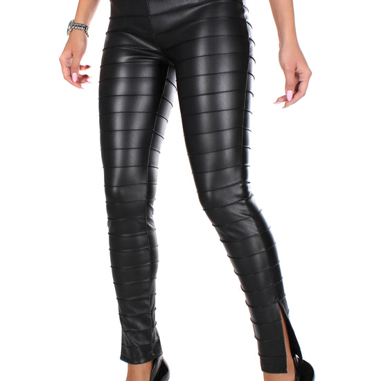 WOMEN’S RIBBED FAUX LEATHER SLIT LEGGINGS LINES — BLACK