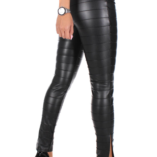 The signature element of this model is the ribbed faux leather paneling that runs across the legs in clean horizontal sections. These panels create a striking architectural effect, visually elongating the legs and giving the leggings a unique textural depth. The carefully constructed lines mimic a sculpted, moto-inspired aesthetic, offering a powerful and contemporary fashion appearance. At the bottom, a refined front slit adds movement, elegance, and a flattering break around the ankle — ideal for showcasing heels or sleek boots.