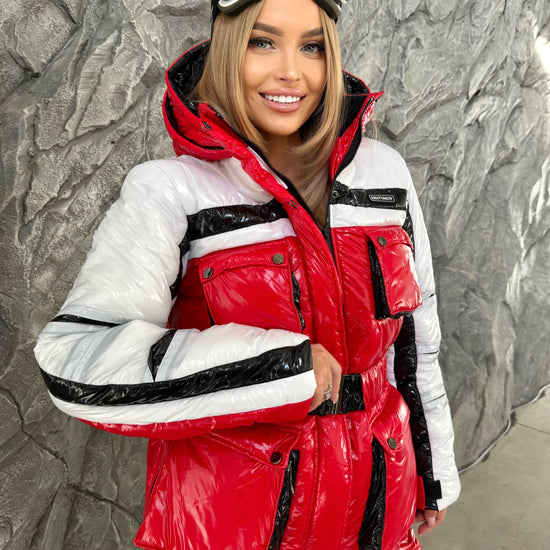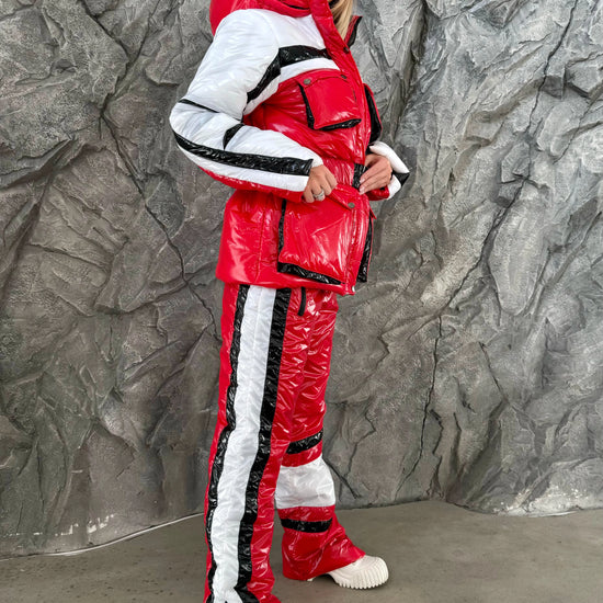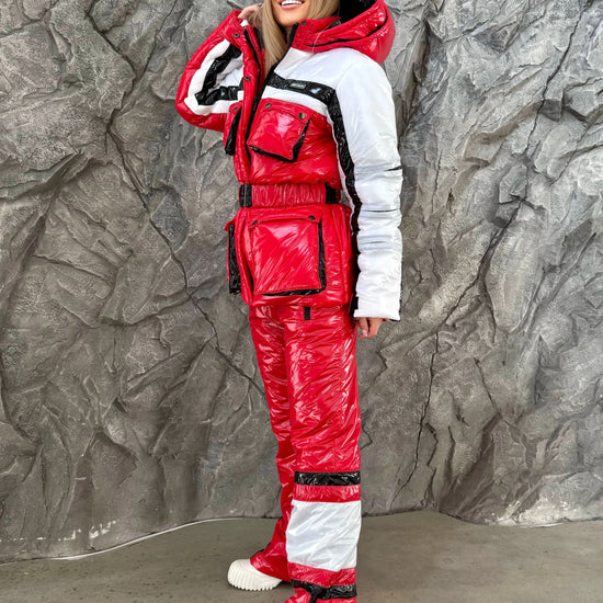This designer red glossy ski suit blends high-end fashion with functionality. Crafted from durable waterproof and windproof fabric, it ensures warmth down to –15°C, while the glossy red finish and contrasting black-white details create a stunning silhouette that demands attention.