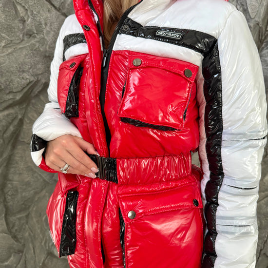 red glossy ski suit women, handmade ski outfit, KRUTYAKOV brand, designer snowsuit, luxury ski wear, premium ski set, glossy ski outfit, snowboard jumpsuit, stylish red winter suit, free express shipping.