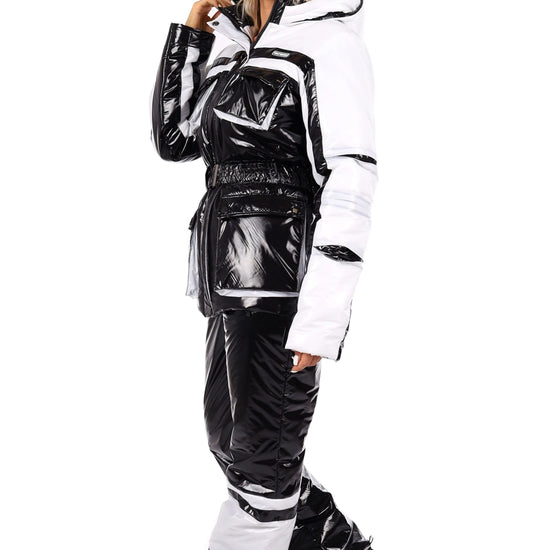 Turn heads on and off the slopes with this luxury glossy black ski jumpsuit, combining fashion, comfort, and technical precision.