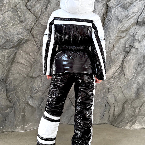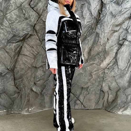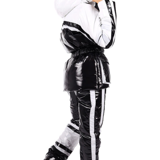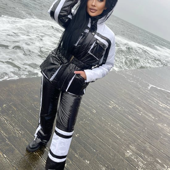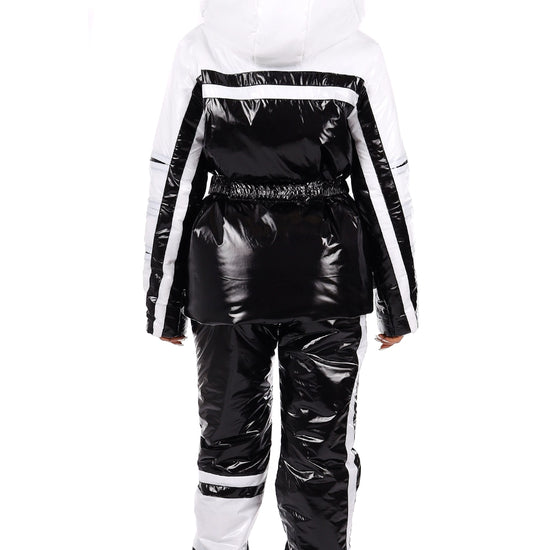 Its glossy black finish, structured silhouette, and tailored belt create a sleek and feminine fit that stands out both in the mountains and après-ski moments.