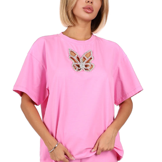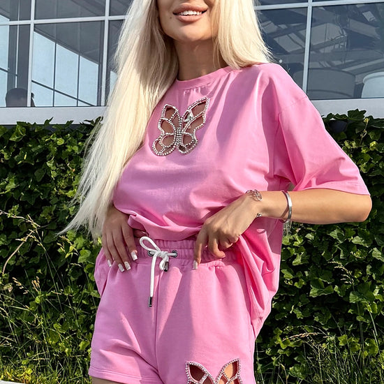 This powder-pink two-piece set is made for those summer days when you want to feel comfy but still look dressed up. Shimmering crystal butterflies catch the light and turn a simple T-shirt and shorts combo into a statement look.