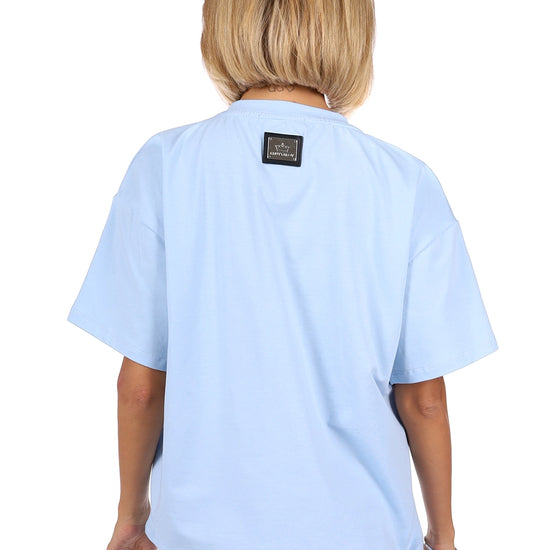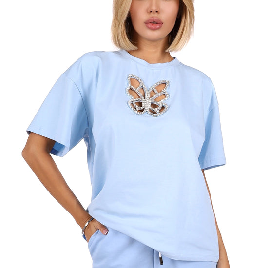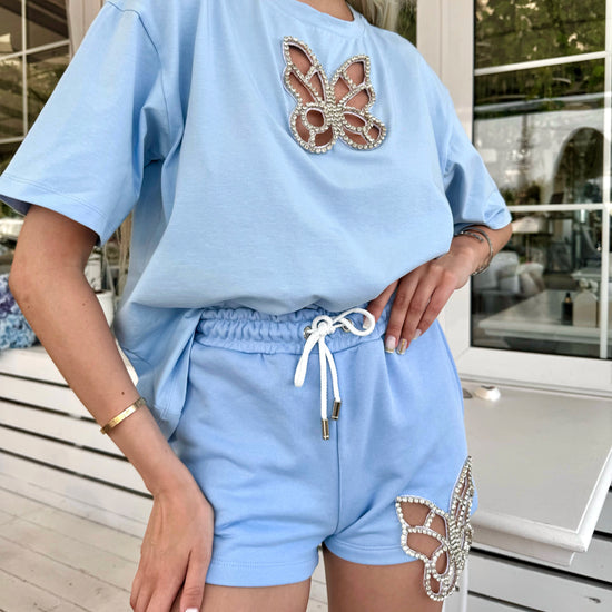 This light blue two-piece shorts set is a perfect buy when you want an easy summer outfit that still looks designer. Crystal butterfly cut-outs on the T-shirt and shorts shimmer in the sun and make every photo stand out.
