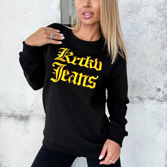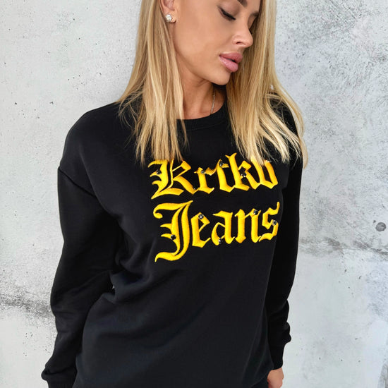 The black KRTKV Jeans women’s sweatshirt is for those who love bold, branded streetwear. A large 3D yellow “Krtkv Jeans” embroidery decorates the front and is highlighted with rhinestones that catch the light and add a premium touch. It looks like a fashion piece, but feels like your coziest everyday sweatshirt.
