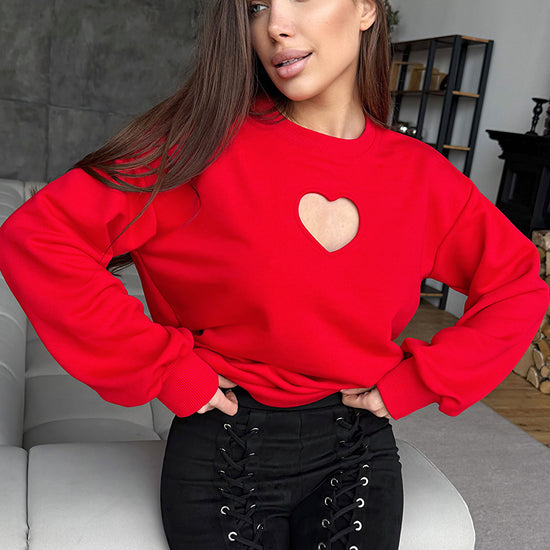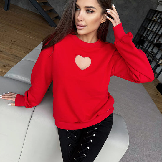 You get a bright red designer-style sweatshirt with a unique heart detail that always attracts attention and still works with most pieces in your wardrobe.