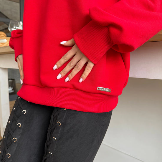 This red women’s sweatshirt is cut in a relaxed oversized fit, so one universal size works beautifully from XS up to L – it just drapes differently on each body.