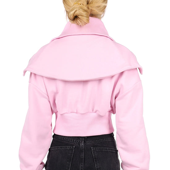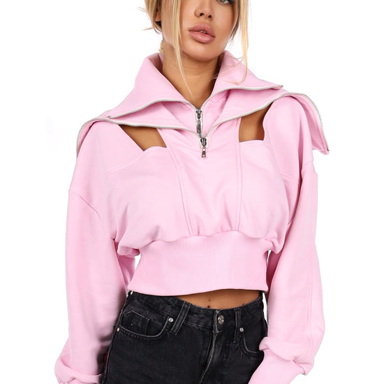This women’s crop sweatshirt combines a romantic pastel pink shade with a strong designer silhouette. The sculpted collar, front zipper and cut-out shoulders create a layered look that instantly turns any outfit into a statement.