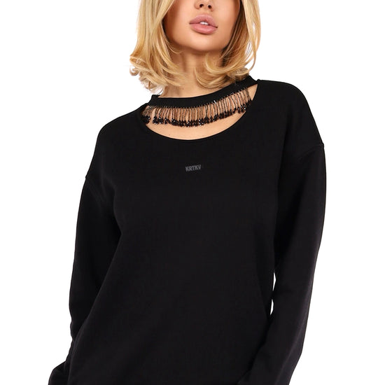 Luna is a black sweatshirt for those who love minimal lines with a strong designer detail. At first glance it’s a clean, straight sweatshirt – but the cut-out neckline with hand-beaded fringe turns it into a true KRUTYAKOV statement piece. The decorative band and shimmering beads create a “necklace” effect, so you don’t even need extra jewellery to look dressed up.