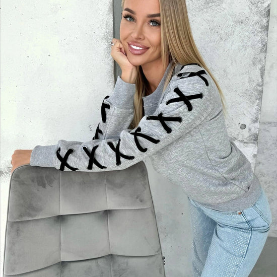 - Grey women’s sweatshirt with cross-ribbon lacing on the sleeves
