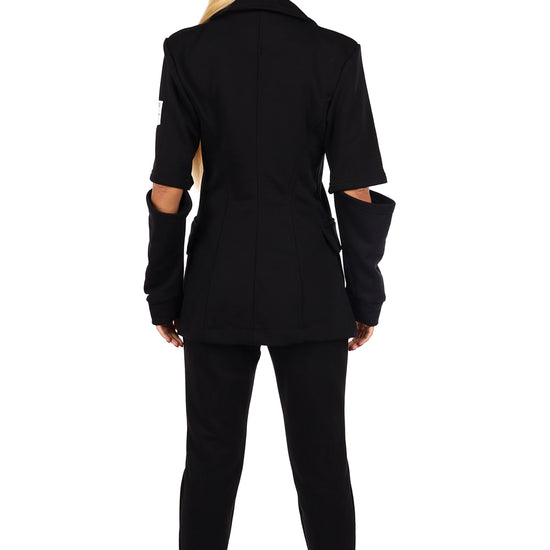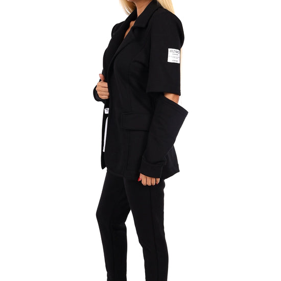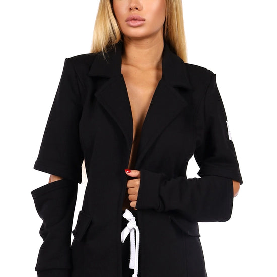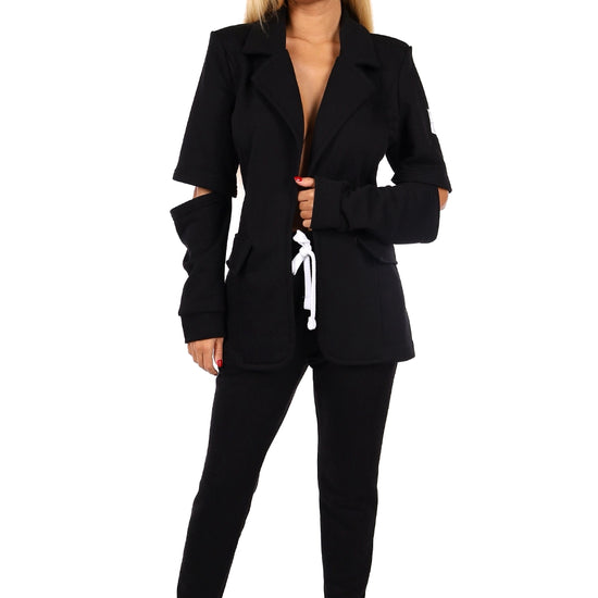 The deep black color is timeless and slimming, while the edgy sleeve cut-outs keep the look modern and bold. You can style it as a women’s suit set with heels, or as a fashion sweat set with sneakers and a crop top – it works both ways.