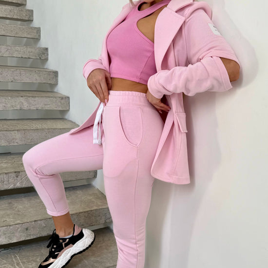 This knit two piece set combines a sharp blazer with relaxed jogger pants, giving you a stylish alternative to a classic pantsuit. The soft pink color makes it perfect for brunch dates, office-casual looks, city walks or travel days when you still want to look put together.