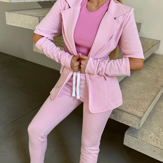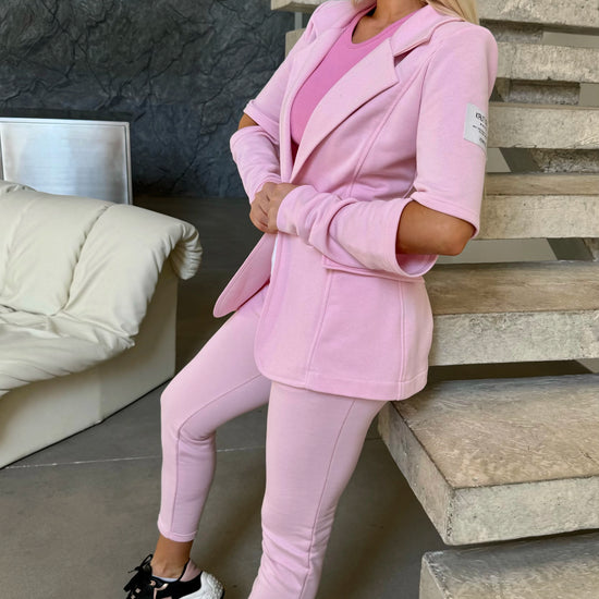 Looking to buy a unique gift for a stylish woman? This pink blazer and joggers set is a fun, modern option for birthdays, holidays or any special occasion.
