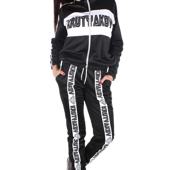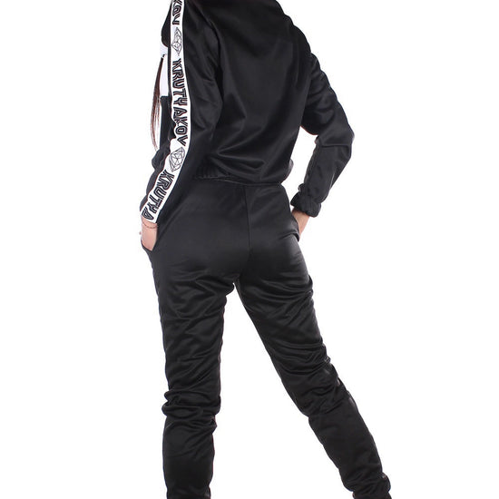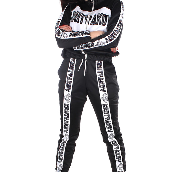 The deep black color is complemented by signature KRUTYAKOV branded side tapes with diamond-inspired graphics. The clean, fitted silhouette adds confidence while keeping the look sporty and feminine. The top features a practical full-length zipper, making it ideal for layering in any season.