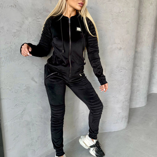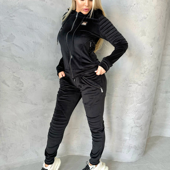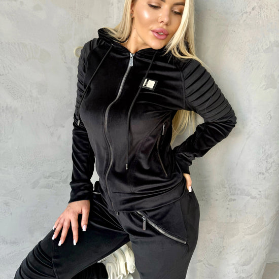 Handmade from premium plush velour, this set features a tailored zip-up hoodie and matching joggers that hug your silhouette beautifully while keeping you warm and stylish.