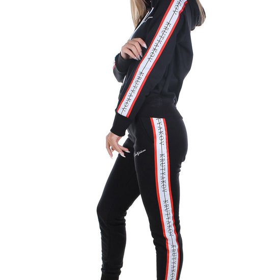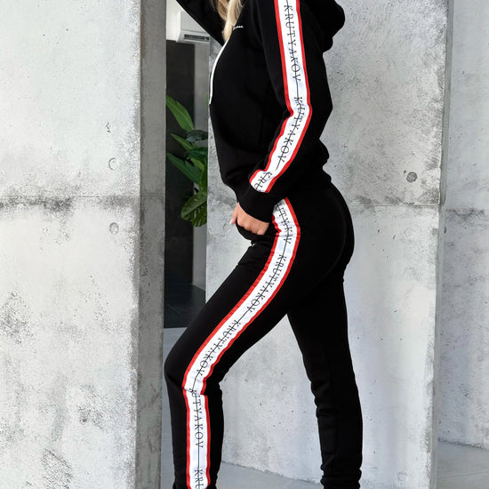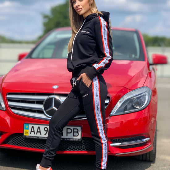 The hoodie and joggers create a sporty silhouette, while the white-red branded lampas add a striking contrast. The fabric is soft inside, resilient outside and ideal for daily wear and active movement.