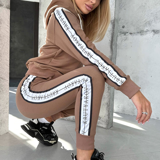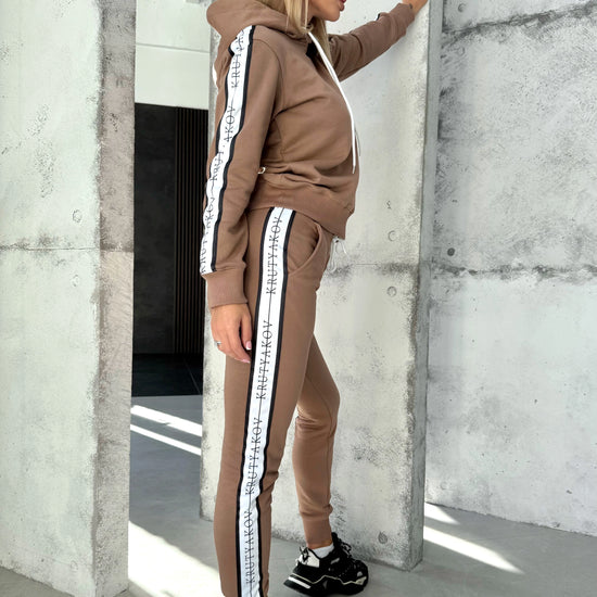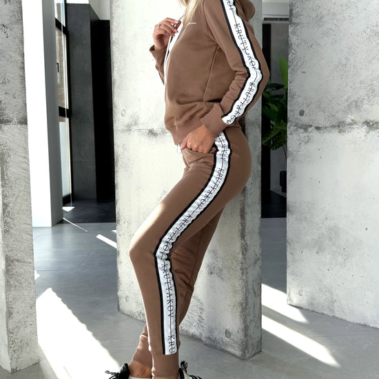 The hoodie and joggers feature our signature branded side stripes, adding a stylish contrast to the calm beige tone. The fit is sporty yet comfortable, making it a versatile choice for everyday wear and active days.