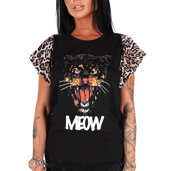 Women’s T-Shirt Meow Leopard Sleeves Black