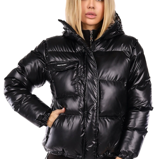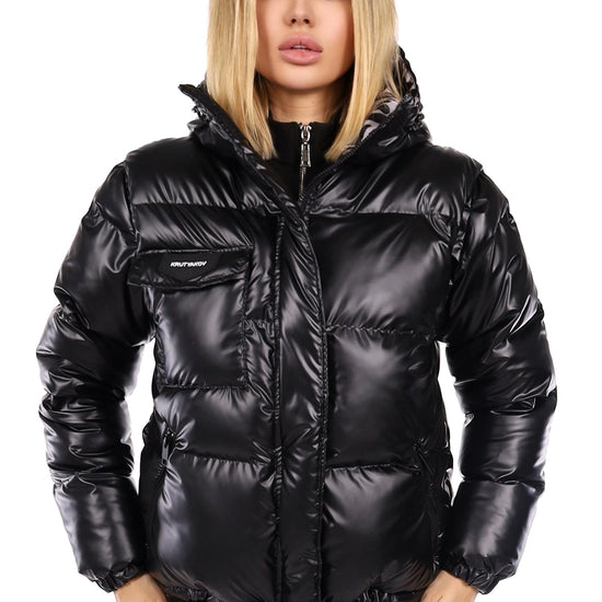 Women’s Alpha Winter Puffer Jacket – Black by KRUTYAKOV is a modern glossy puffer created for women who want real winter warmth, comfort, and a bold designer look. The jacket features a sculpted, slightly oversized silhouette that feels cozy yet light, making it perfect for everyday wear in cold weather, city walks, and winter trips.