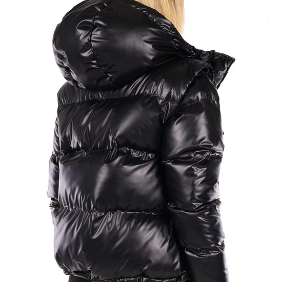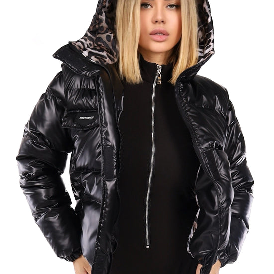 This women’s winter puffer jacket is designed to work effortlessly with leggings, jeans, joggers, and chunky boots, creating a contemporary streetwear look with a feminine edge. The glossy black finish and leopard hood lining make the Alpha jacket stand out while still being easy to style with your existing wardrobe.