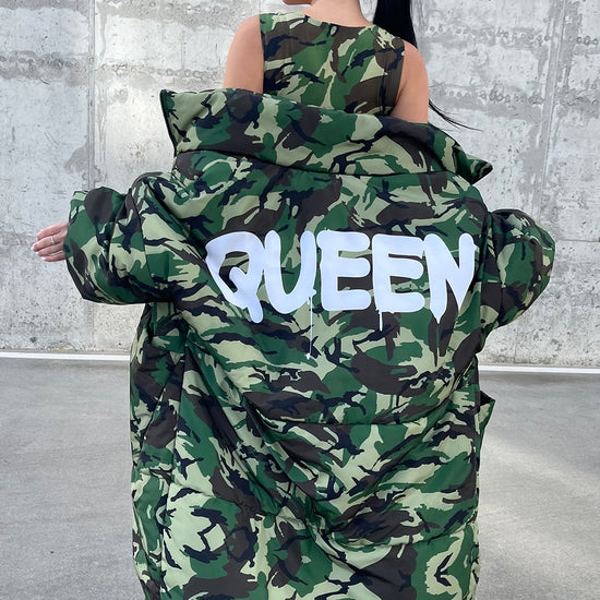 Its signature camo print gives the coat a dynamic, fashion-forward look, while the large QUEEN lettering on the back transforms it into a standout piece that instantly draws attention. Warm, durable, and lightweight, this coat is crafted for real winter conditions — perfect for cold-weather travel, long walks, city styling, and everyday comfort.